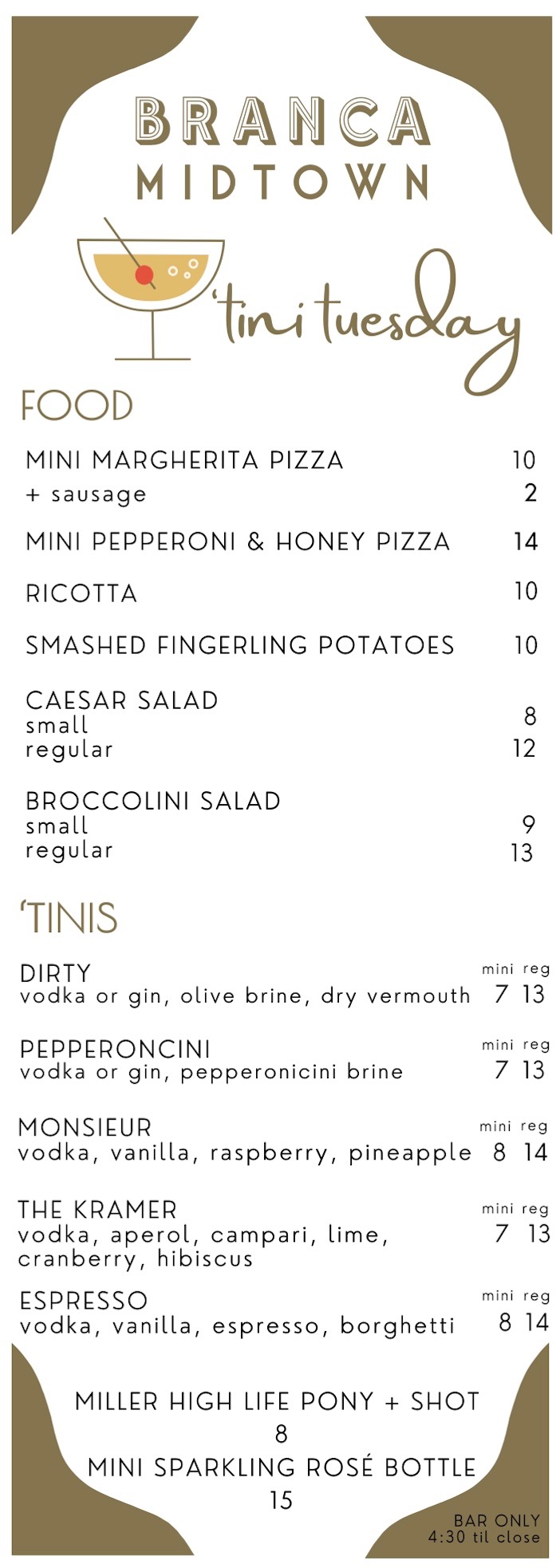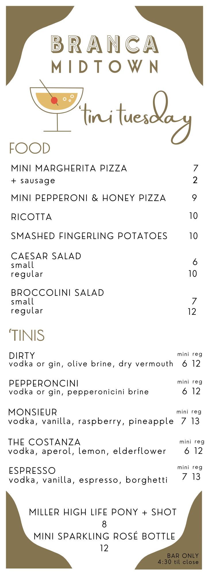 Everything’s tiny… except the fun! Every Tuesday at the bar, enjoy snack-sized pizzas, small bites, and our famous tiny martinis—all perfectly portioned to mix, match, and savor. Whether it’s a Dirty, Pepperoncini, or Espresso ‘tini, these little pours pack a big punch. Join us from 4:30 to close—proof that the best things really do come in small packages.